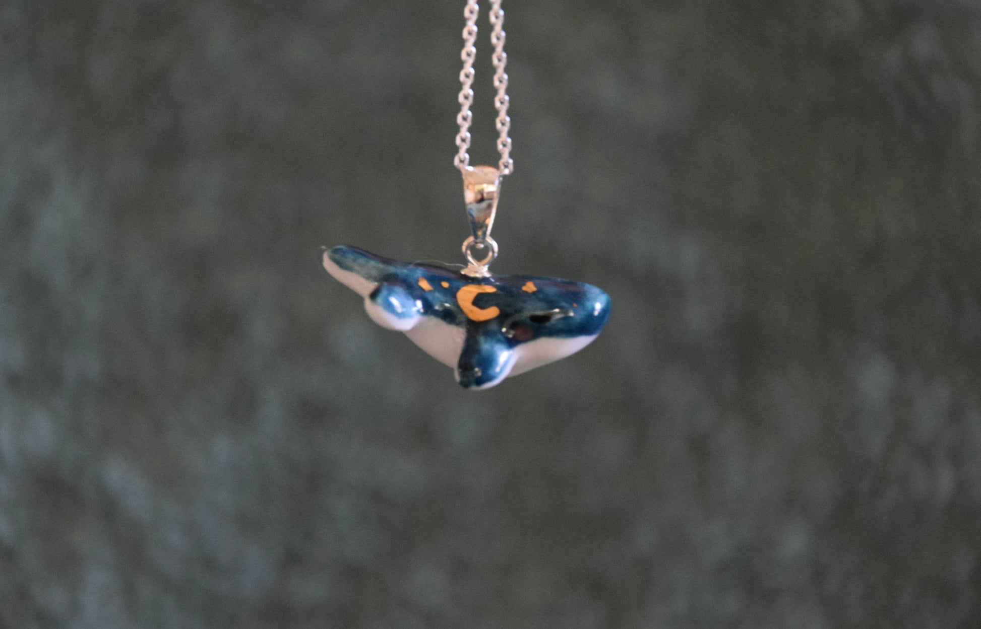 Hand sculpted porcelain Whale with hand painted gold luster.